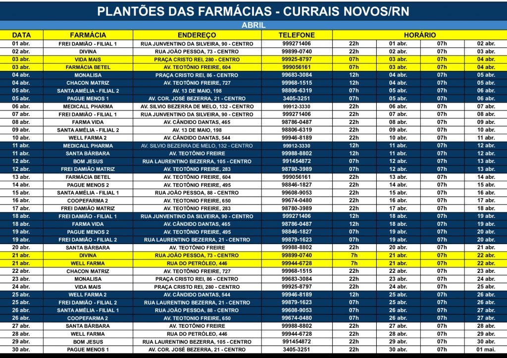 RELAÇÃO DAS FARMÁCIAS DE PLANTÃO EM CURRAIS NOVOS- MARÇO DE 2026 Postado em 18 de dezembro de 2018 - 18:11h