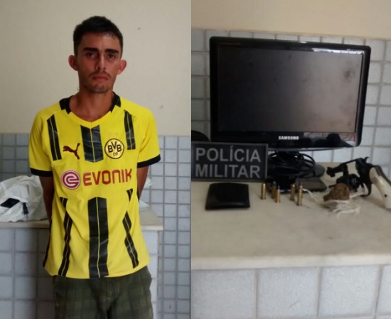 OS POLICIAIS ESTAVAM FAZENDO UMA BLITZ QUANDO O APENADO APARECEU EM UMA MOTOCICLETA E AINDA TENTOU FUGIR, MAS FOI ALCANÇADO E ABORDADO PELOS PM’s. COM ELE FOI APREENDIDO UM REVÓLVER CALIBRE 38 COM 06 MUNIÇÕES INTACTAS, UMA CERTA QUANTIA DE DROGA (MACONHA) E UM MONITOR DE COMPUTADOR, POSSIVELMENTE FURTADO.