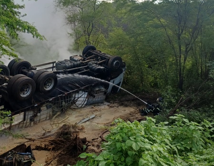 Segundo a PRF, o produto é considerado perigoso e foi registrado vazamento no local do acidente, que fica às margens da rodovia federal. O Corpo de Bombeiros foi acionado, mas ainda não há atualização sobre danos ao ambiente.