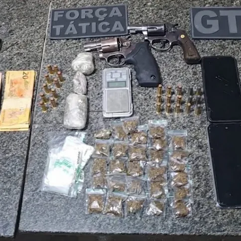 Durante a revista, os militares localizaram dois revólveres, diversas munições, drogas, uma balança de precisão, materiais utilizados para embalar entorpecentes e balaclavas, acessórios comumente usados para dificultar a identificação em ações criminosas.