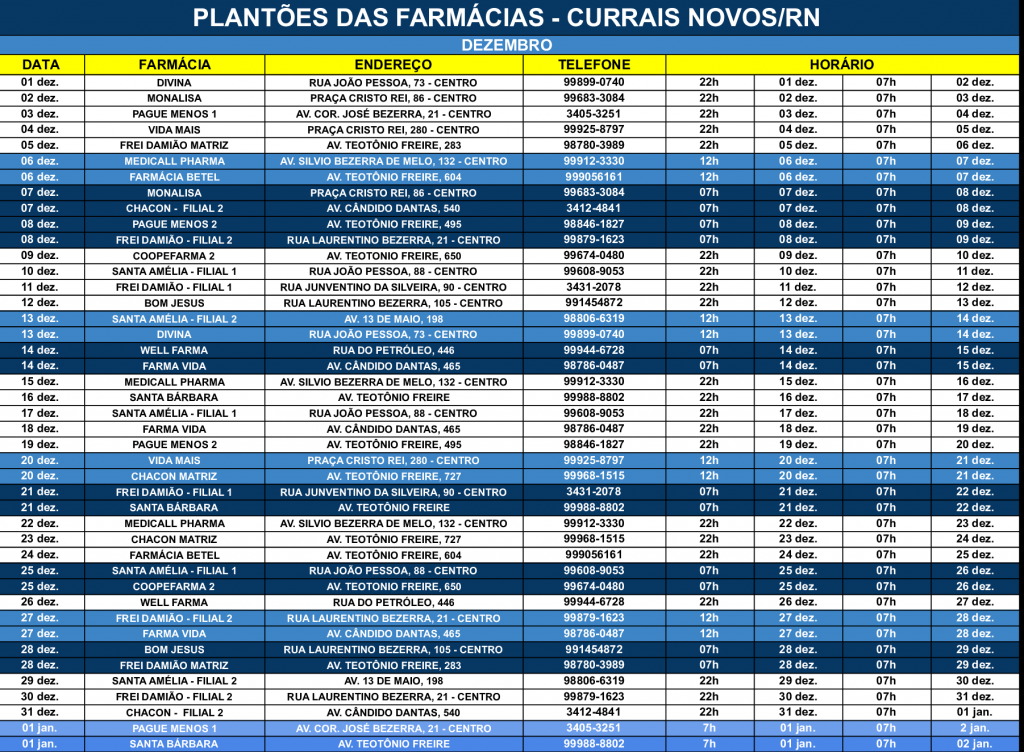 RELAÇÃO DAS FARMÁCIAS DE PLANTÃO EM CURRAIS NOVOS- DEZEMBRO DE 2025