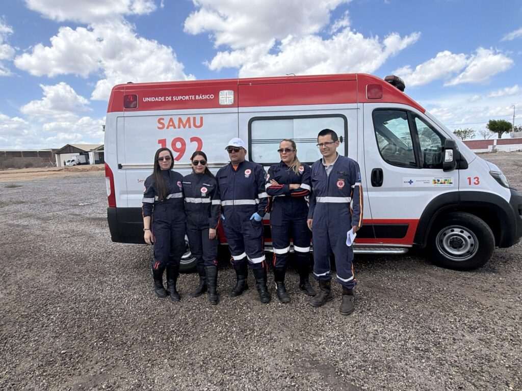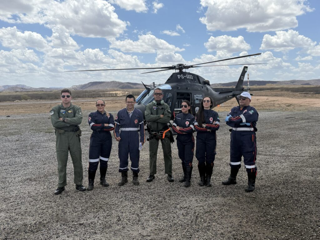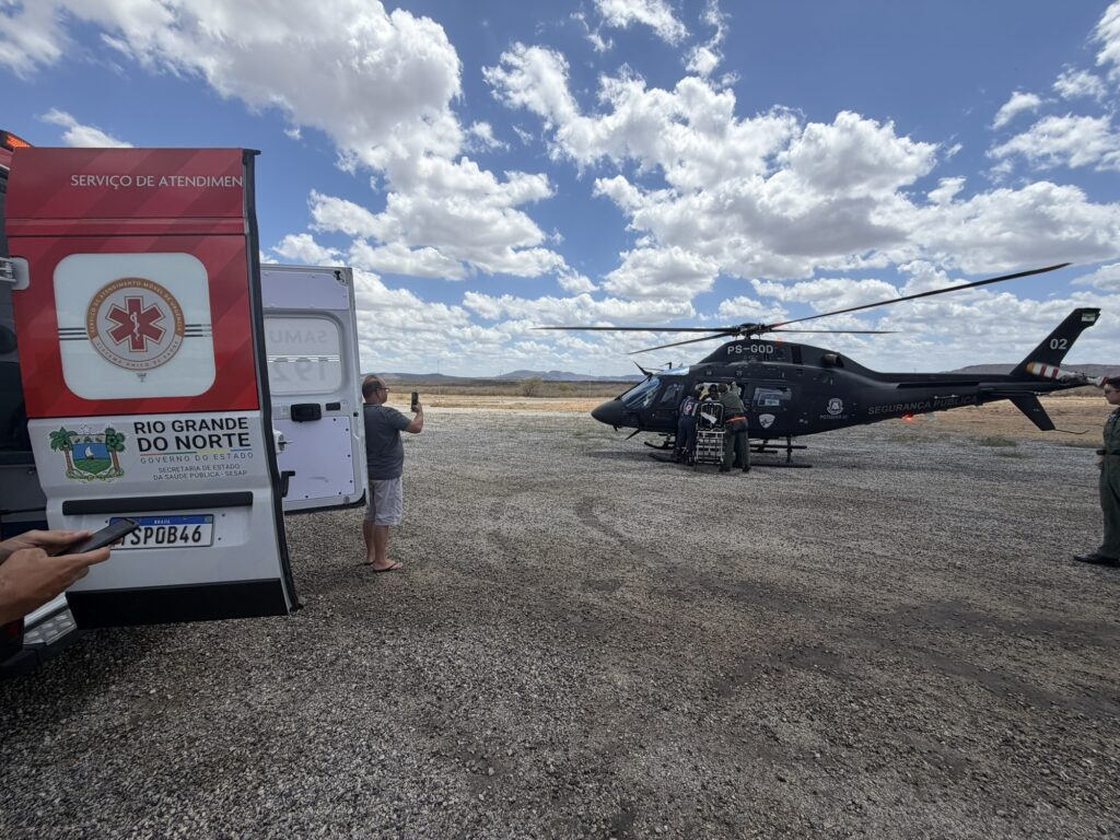 Uma equipe do SAMU foi mobilizada para fazer a remoção da paciente do hospital até o helicóptero, que pousou no aeródromo de Currais Novos, garantindo agilidade e segurança no deslocamento.