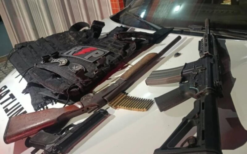 Já no percurso em direção à área do Pontal, as guarnições localizaram a dupla. Segundo a Polícia Militar, os suspeitos estavam utilizando coletes à prova de balas e portavam armamento de grosso calibre, entre eles um fuzil e uma carabina.
