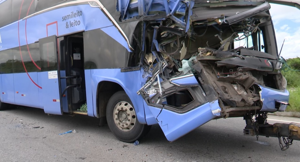 [Vídeo] Ônibus que saiu de Natal para Fortaleza se envolve em acidente com carreta no Ceará; três pessoas ficam feridas